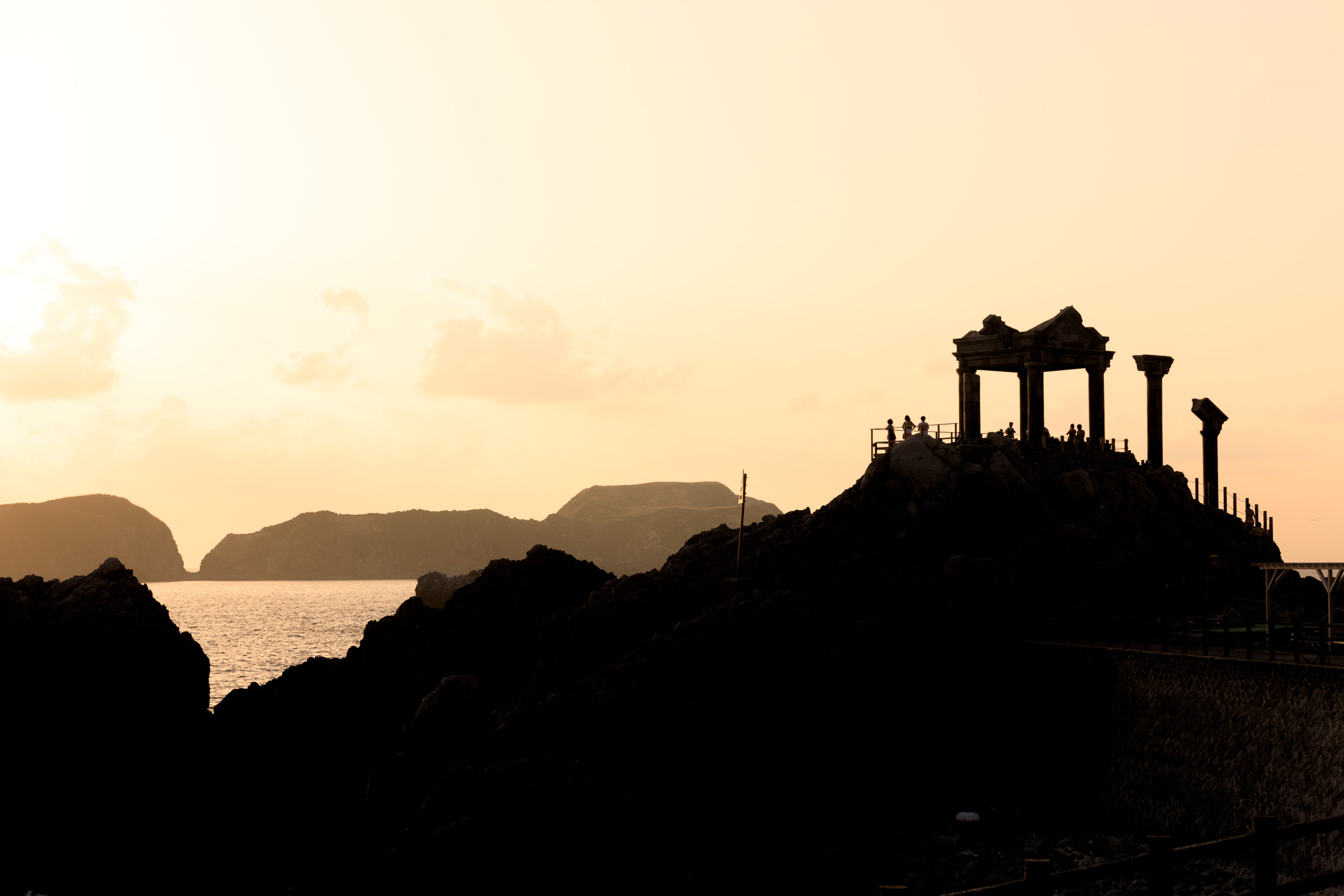 Ancient ruins overlooking the ocean at sunset at Scenic Yunohama Roten Hot Spring.