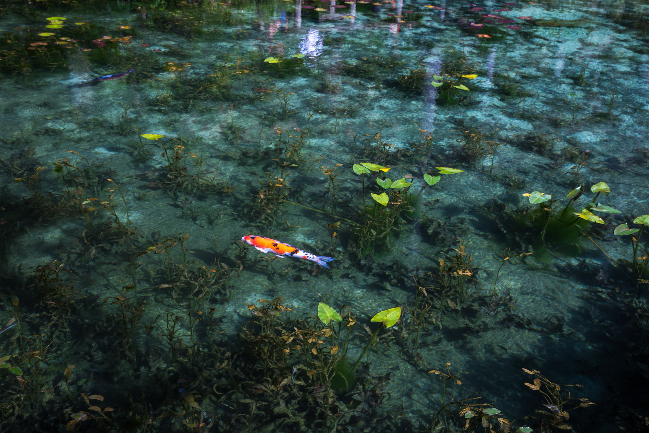 Serene emerald pond mirrors lush greenery and vibrant underwater life.