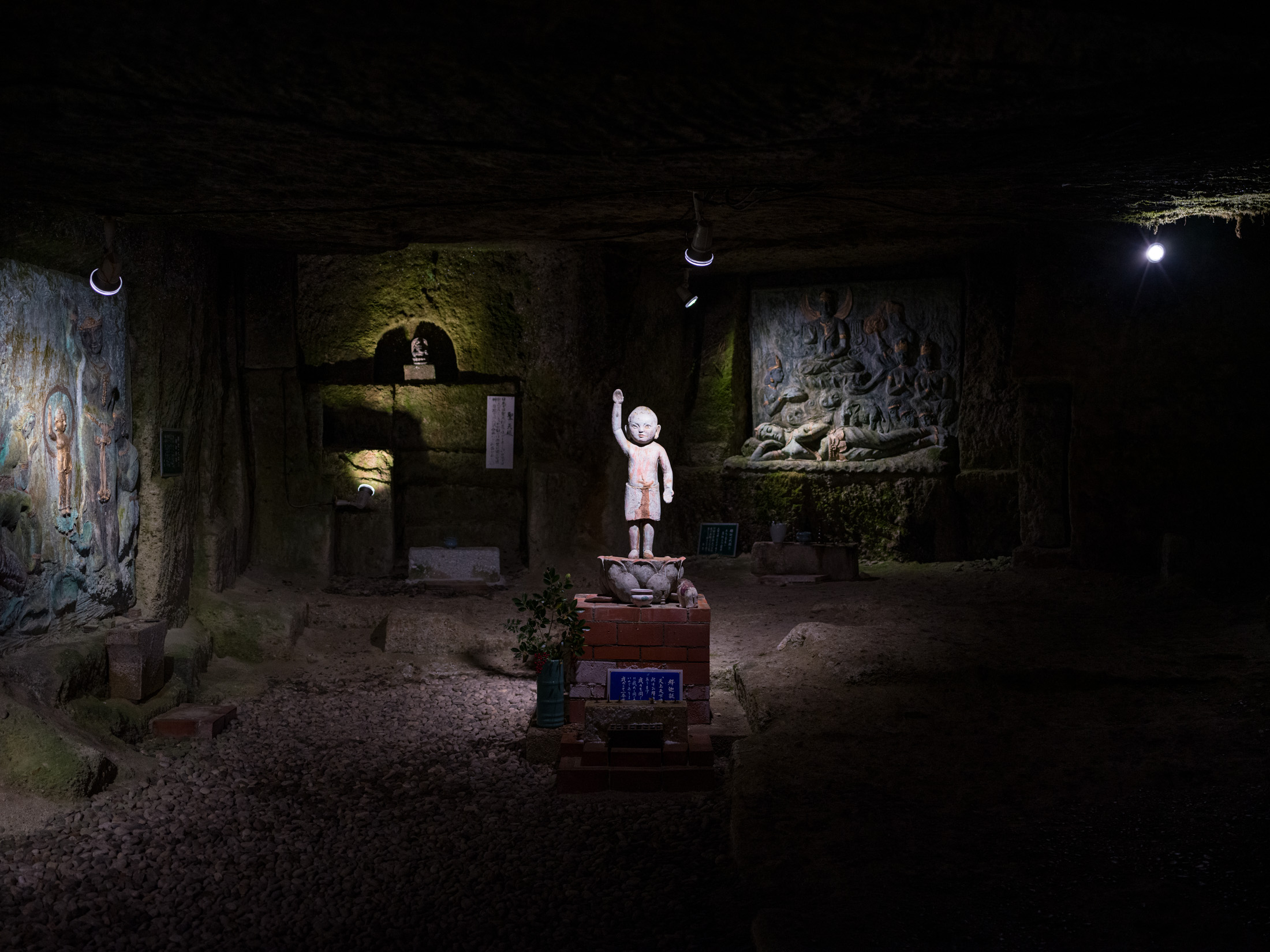 Dimly-lit cave passage reveals intricate stone sculptures in Yuma Tsugatas underground atelier.