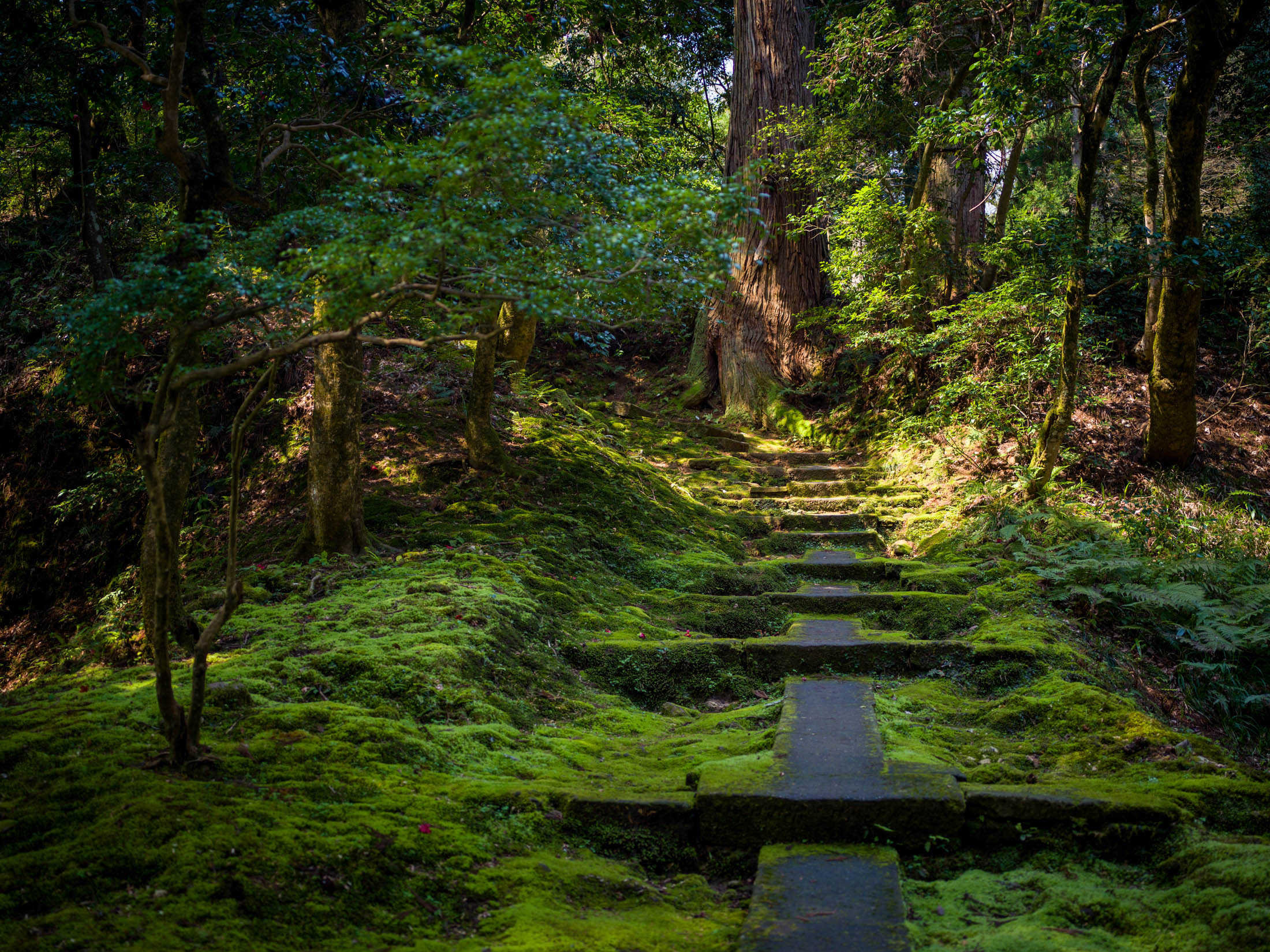 Mossy stone steps wind through an enchanted forest toward Natadera Temples hidden sanctuary.