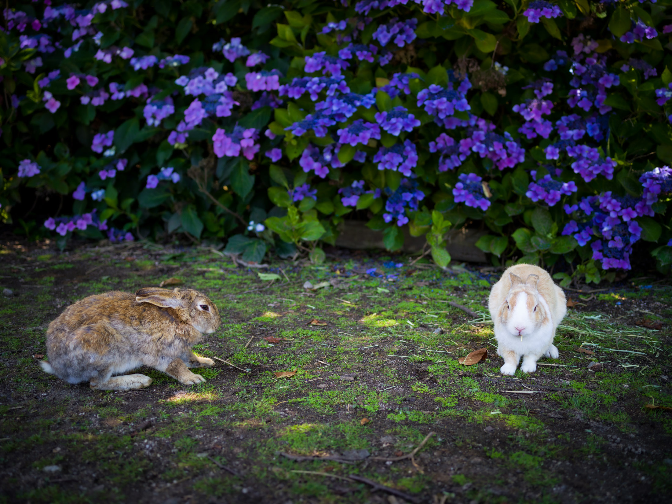 Rabbits in Lush Purple Flower Garden