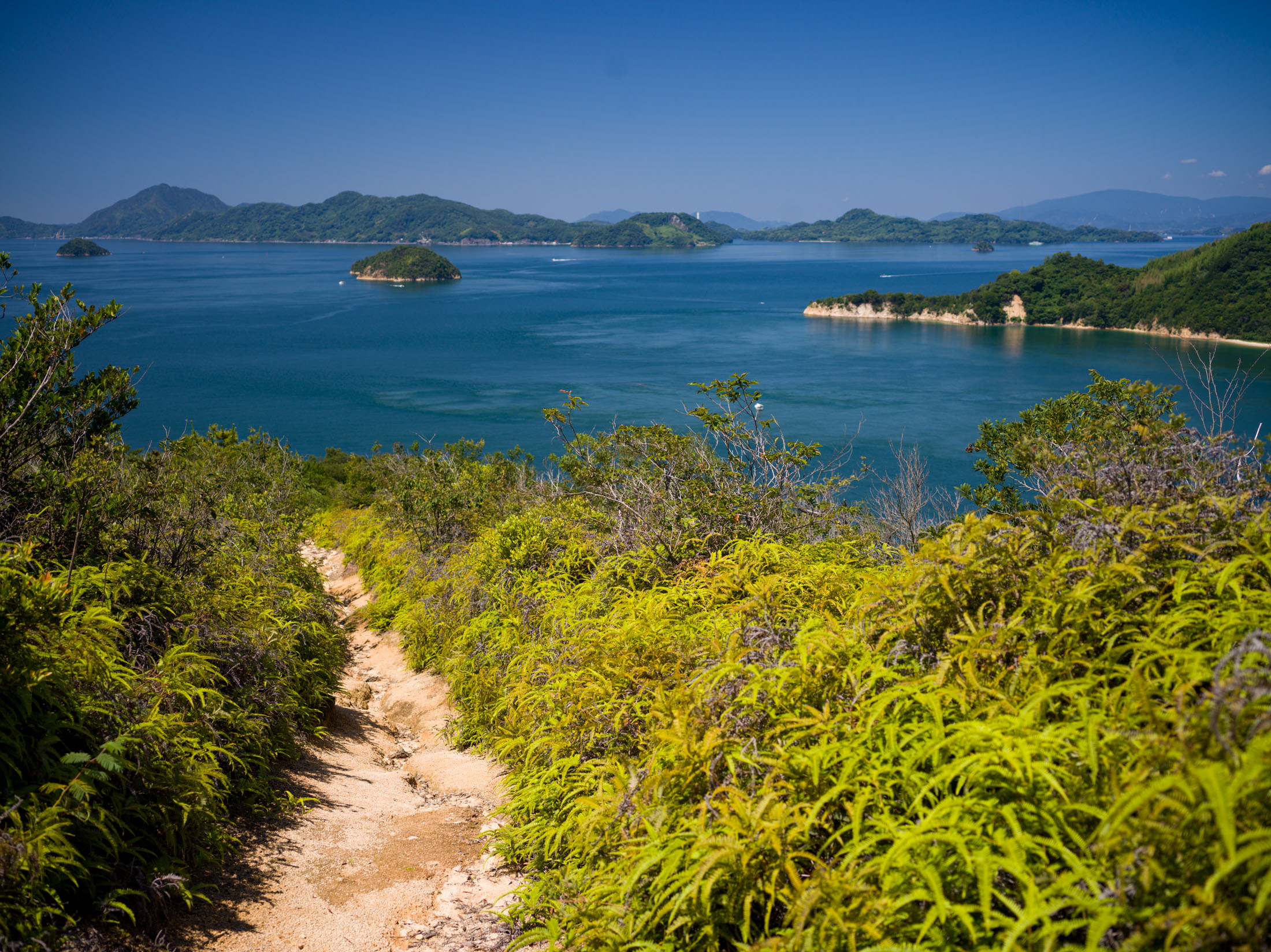Verdant coastal path winds through lush forest to turquoise sea with rocky islets.