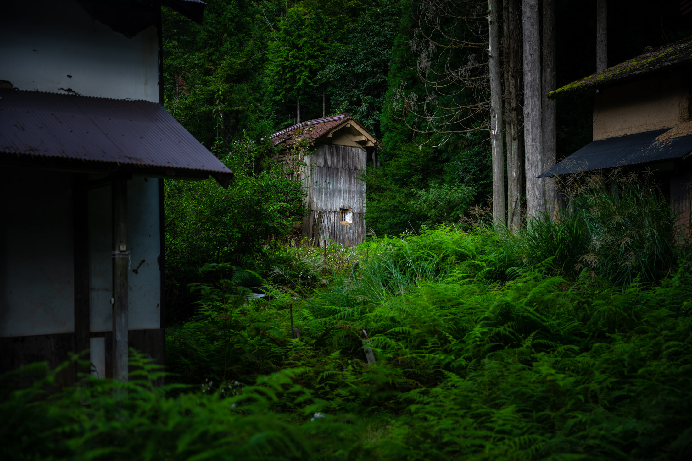Serene mossy forest retreat with rustic wooden shed nestled in lush greenery.
