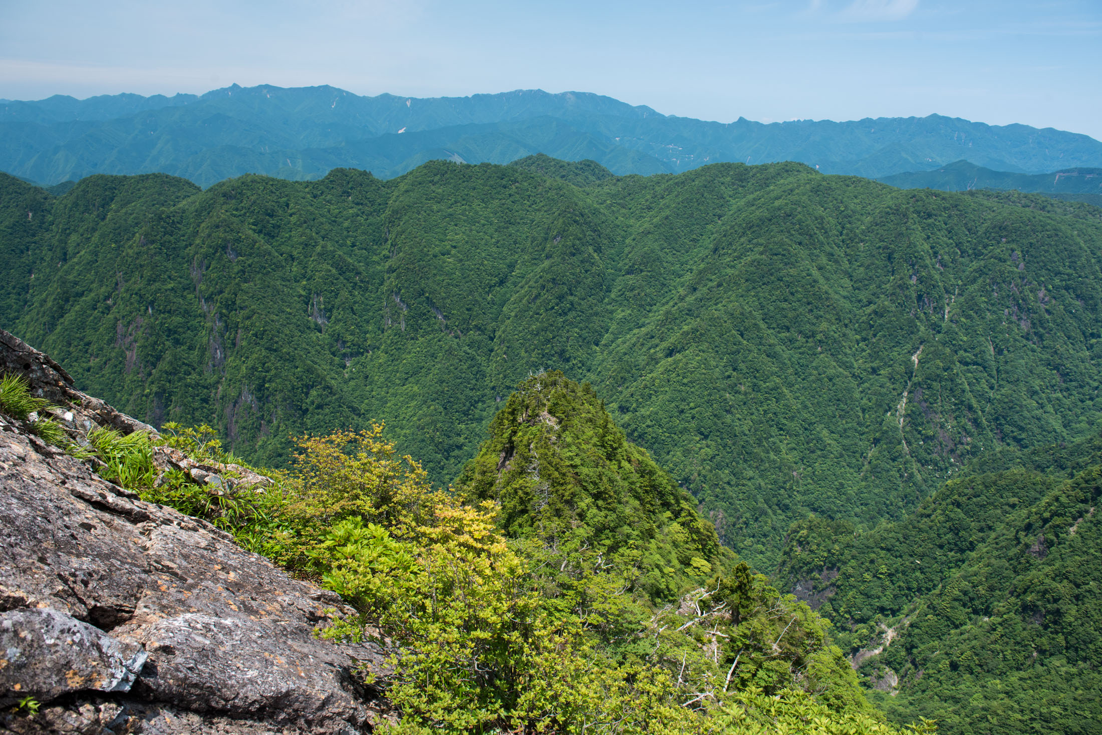 Layered forest ridges stretch from a rocky overlook at Mount Ōdaigahara, Japan, under a pale blue sky.