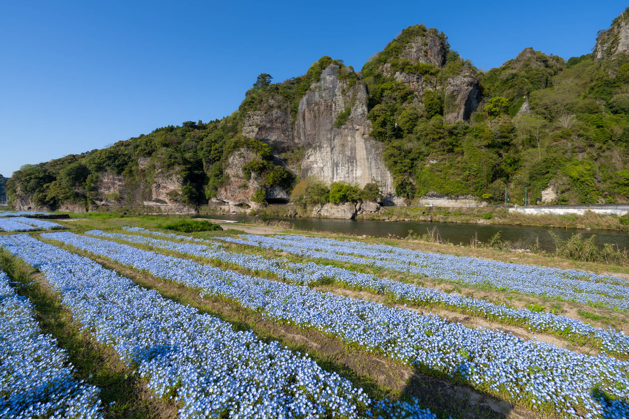 Pale blue flower fields in Yabakei, Japan, beside a calm river with dramatic rocky cliffs under a clear blue sky.