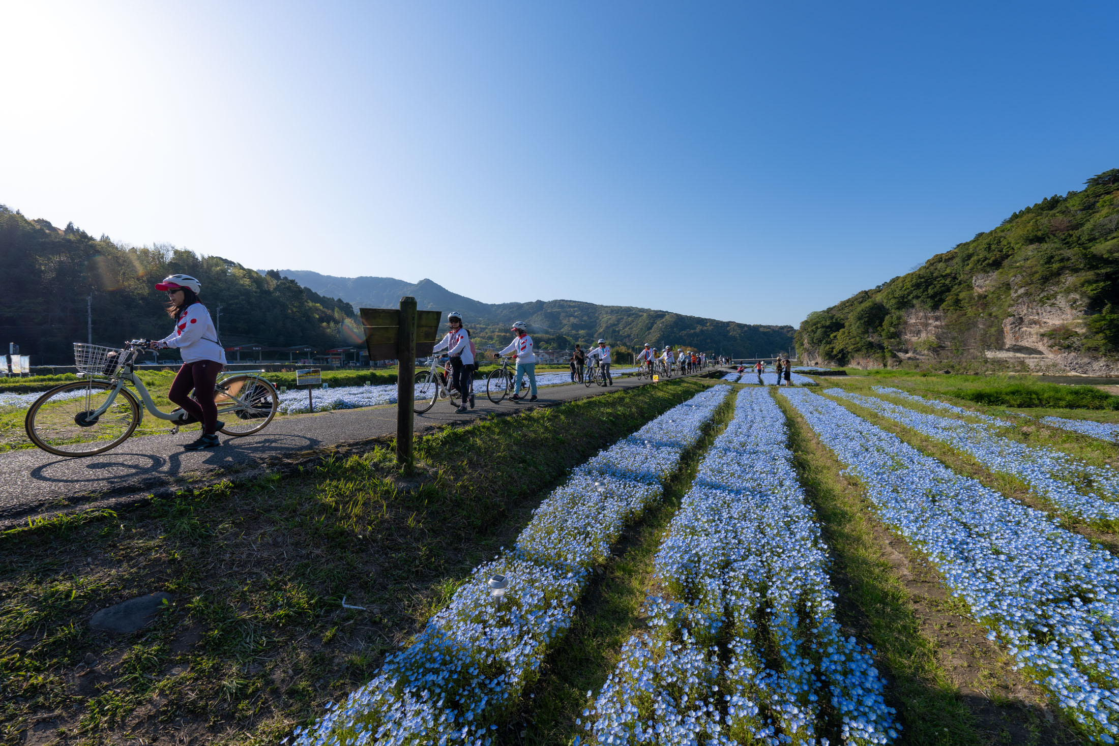 Cyclists ride a scenic path beside blooming blue flower fields in Yabakei, Japan, under a clear sky.