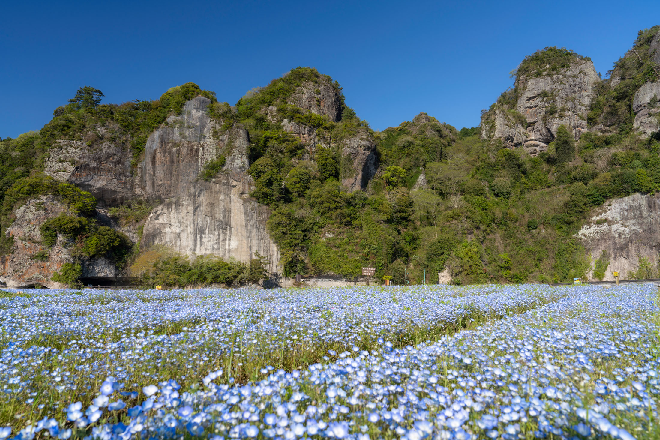 Blue wildflower meadow in Yabakei, Japan, beneath rugged cliffs and a clear blue sky.