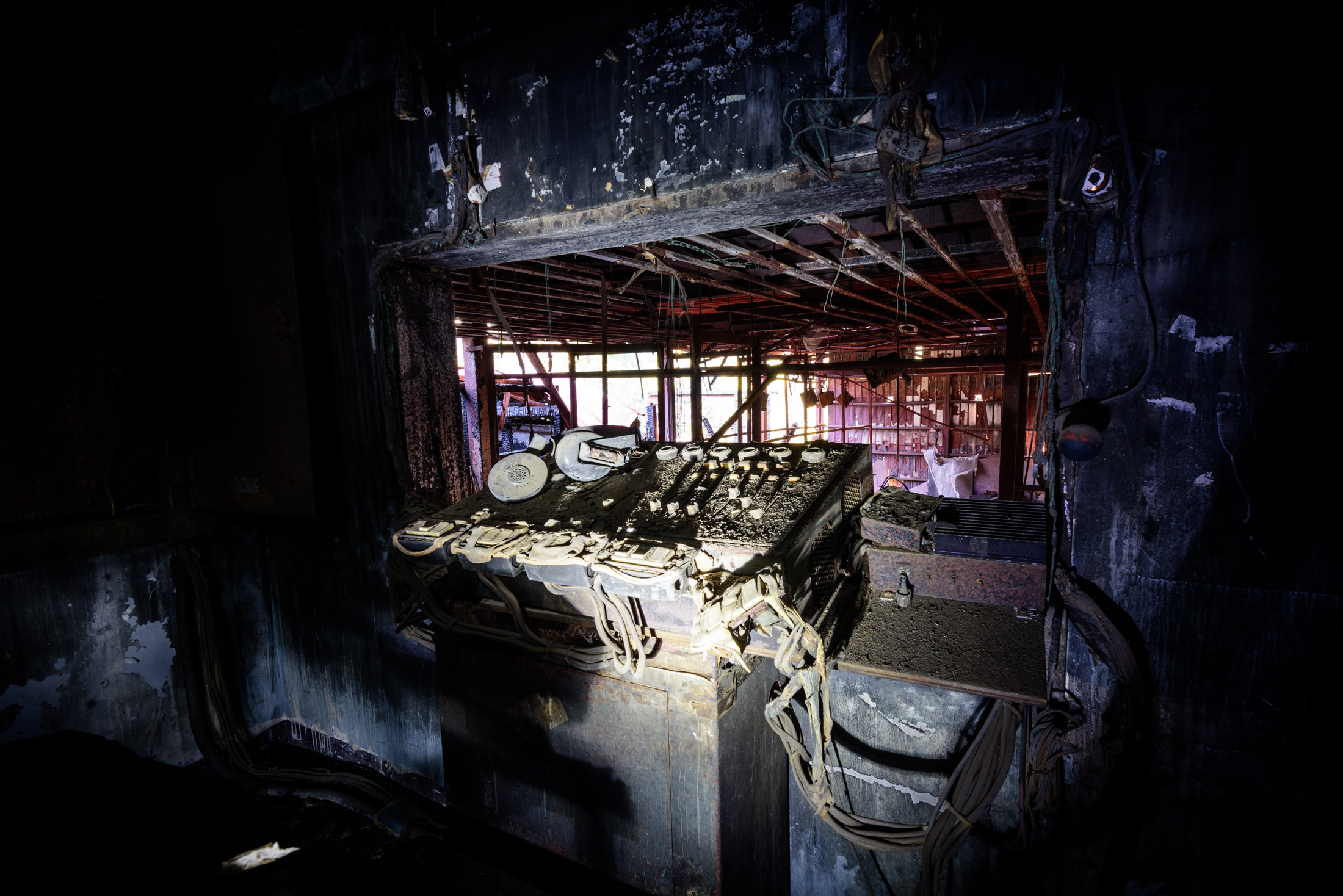 Dim, eerie interior of an abandoned strip club in Ibaraki, Japan.