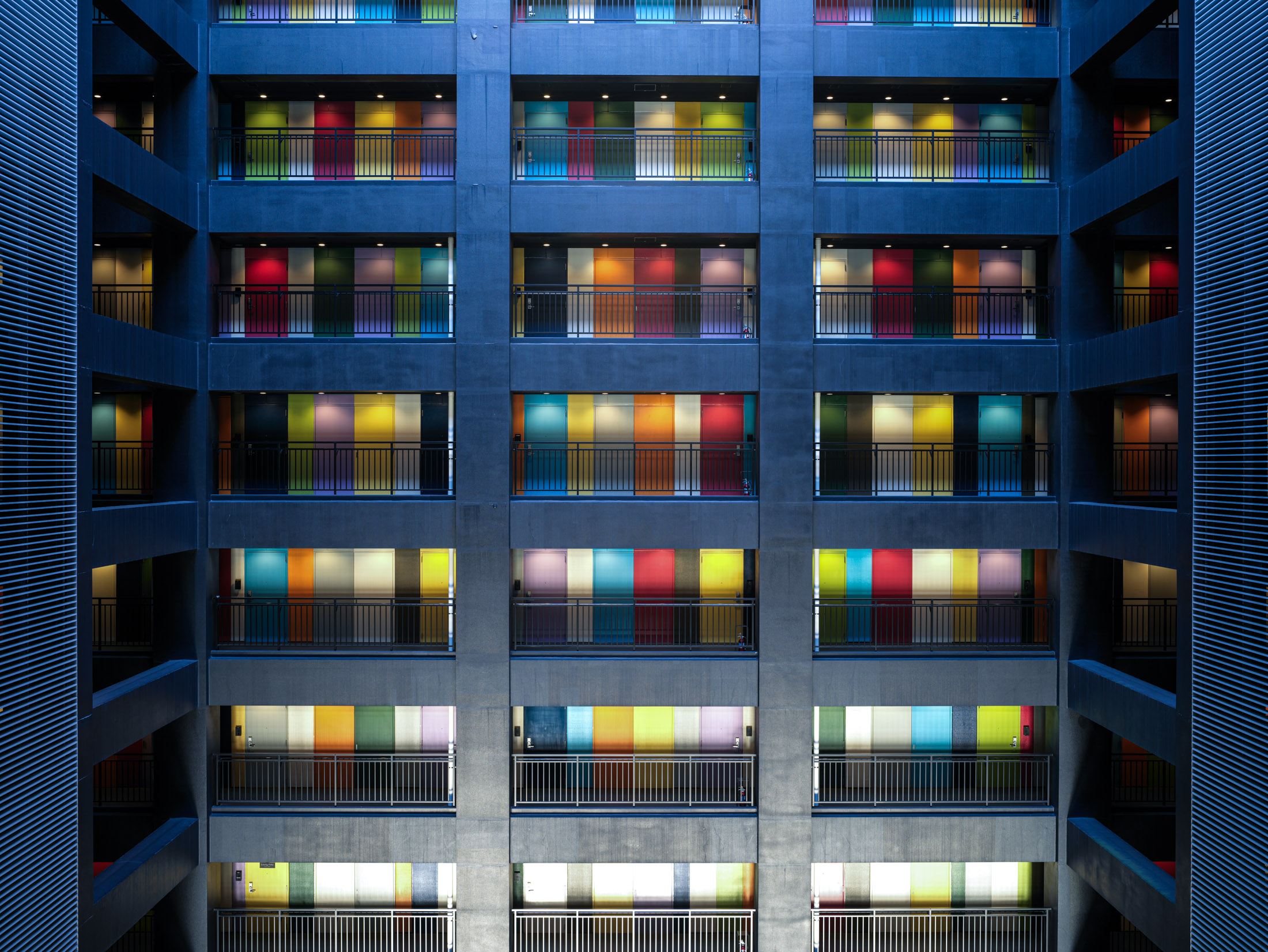 Vibrant corridor with colorful doors lining a sleek office space.