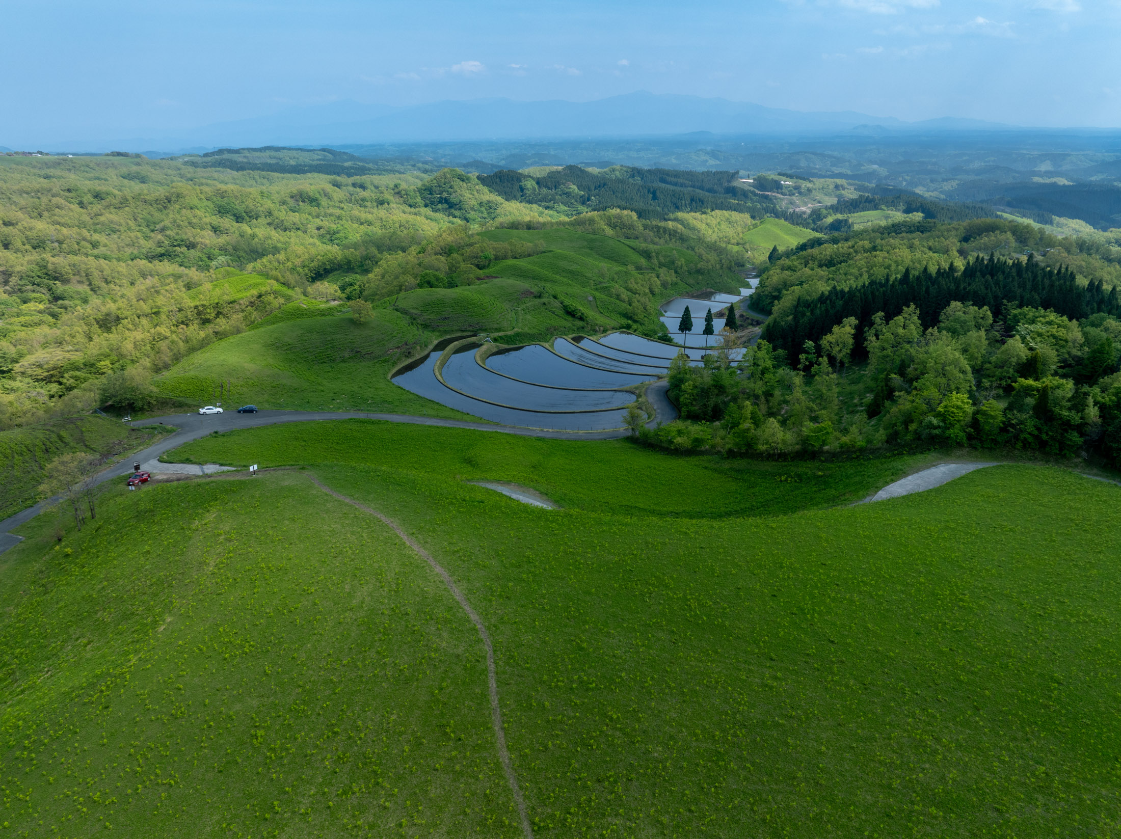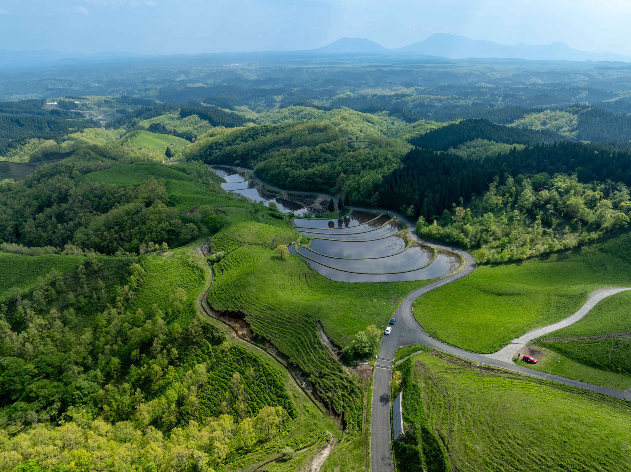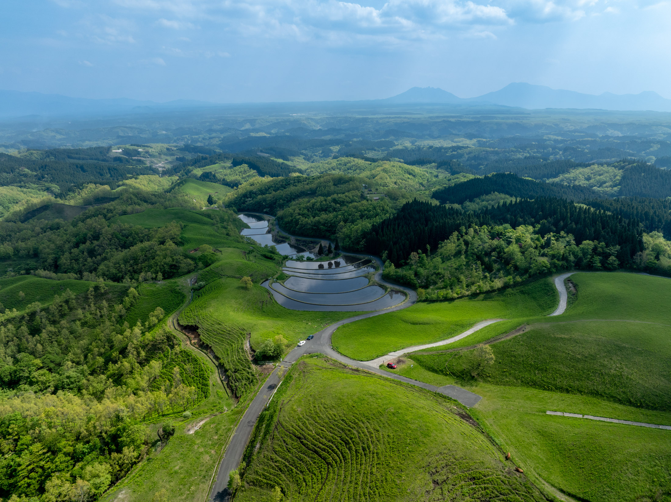 Aerial view of Ogi’s terraced rice paddies curving across green hills, with water-filled fields reflecting the sky.