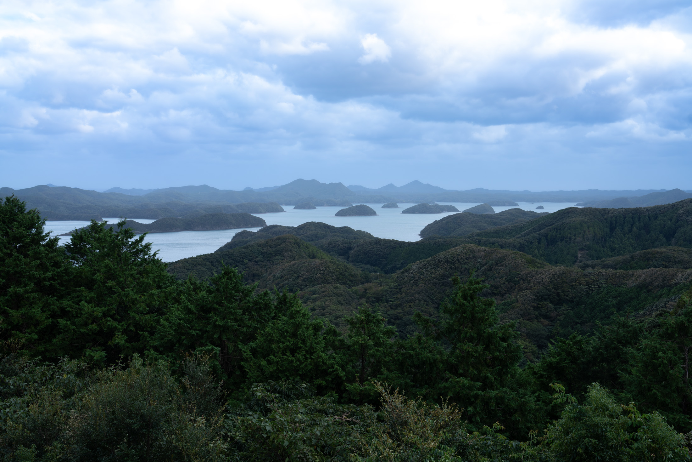 View from Mount Eboshi over forested hills and a calm island-dotted coastline beneath an overcast sky.