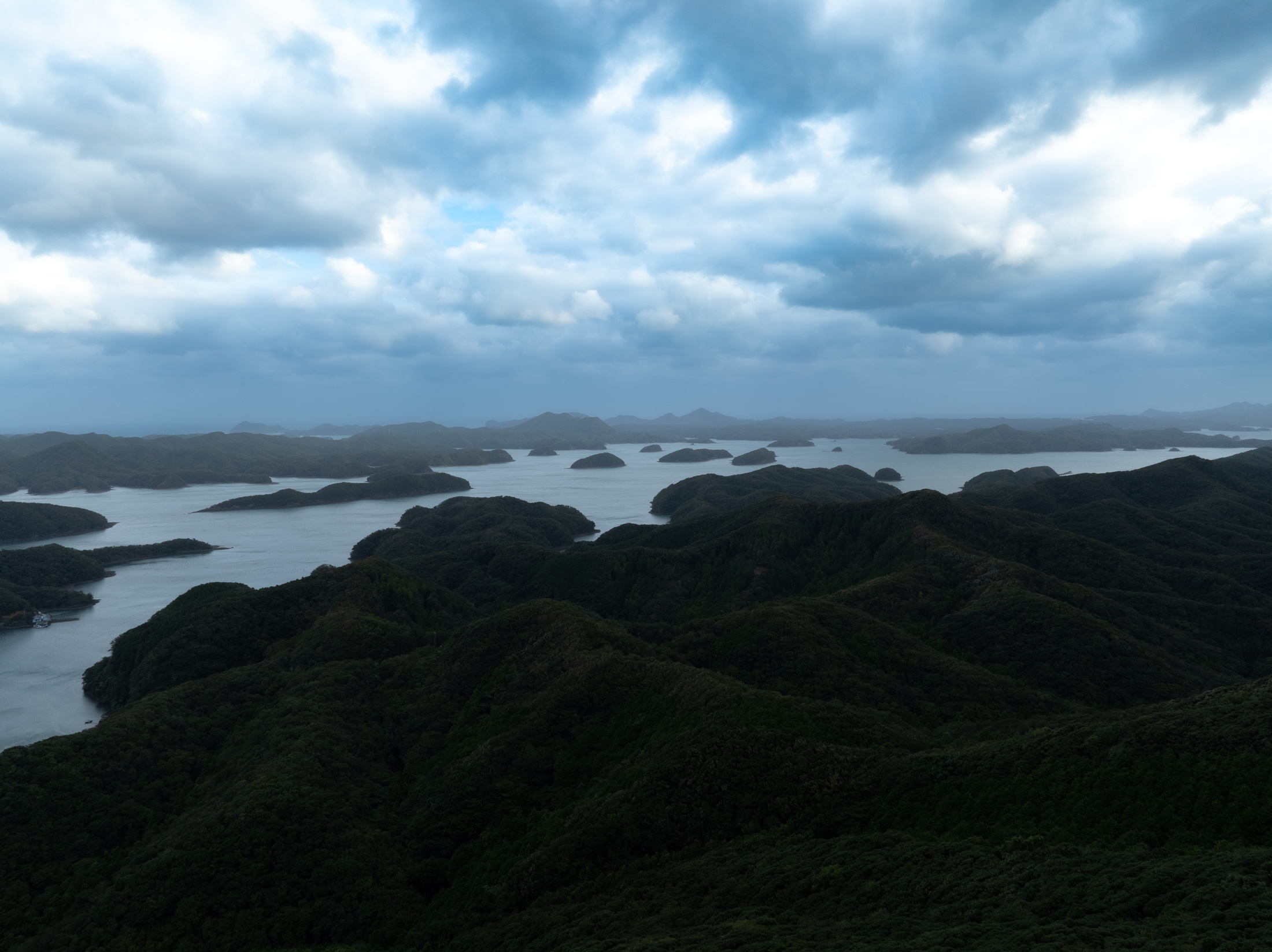 Mount Eboshi overlook with layered forested ridges and island-dotted waters beneath a dramatic cloudy sky.