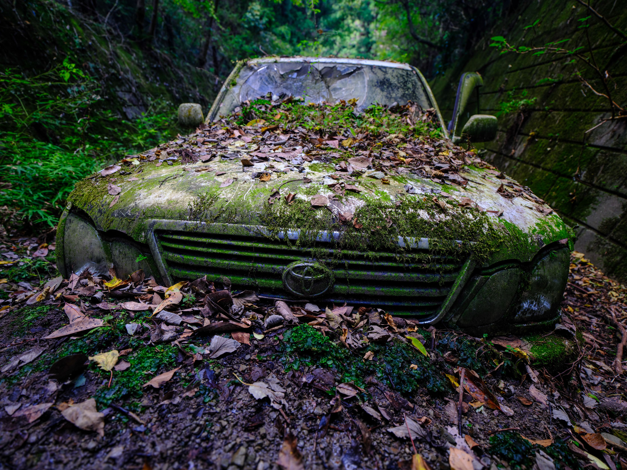 Abandoned Toyota Land Cruiser slowly reclaimed by moss and leaf litter in a dense forest.