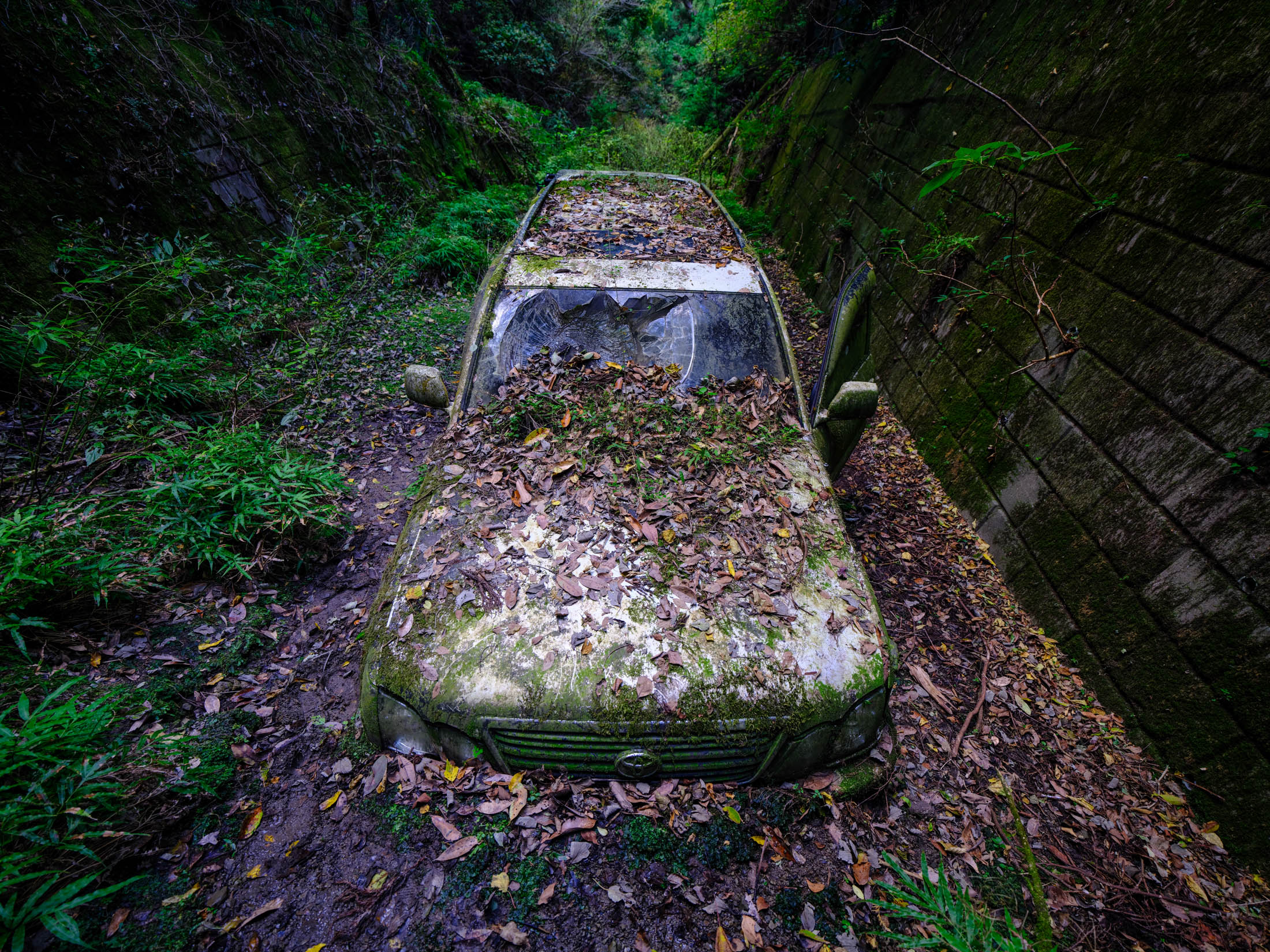 Abandoned Land Cruiser slowly reclaimed by moss and ferns on an overgrown forest trail beside a stone retaining wall.