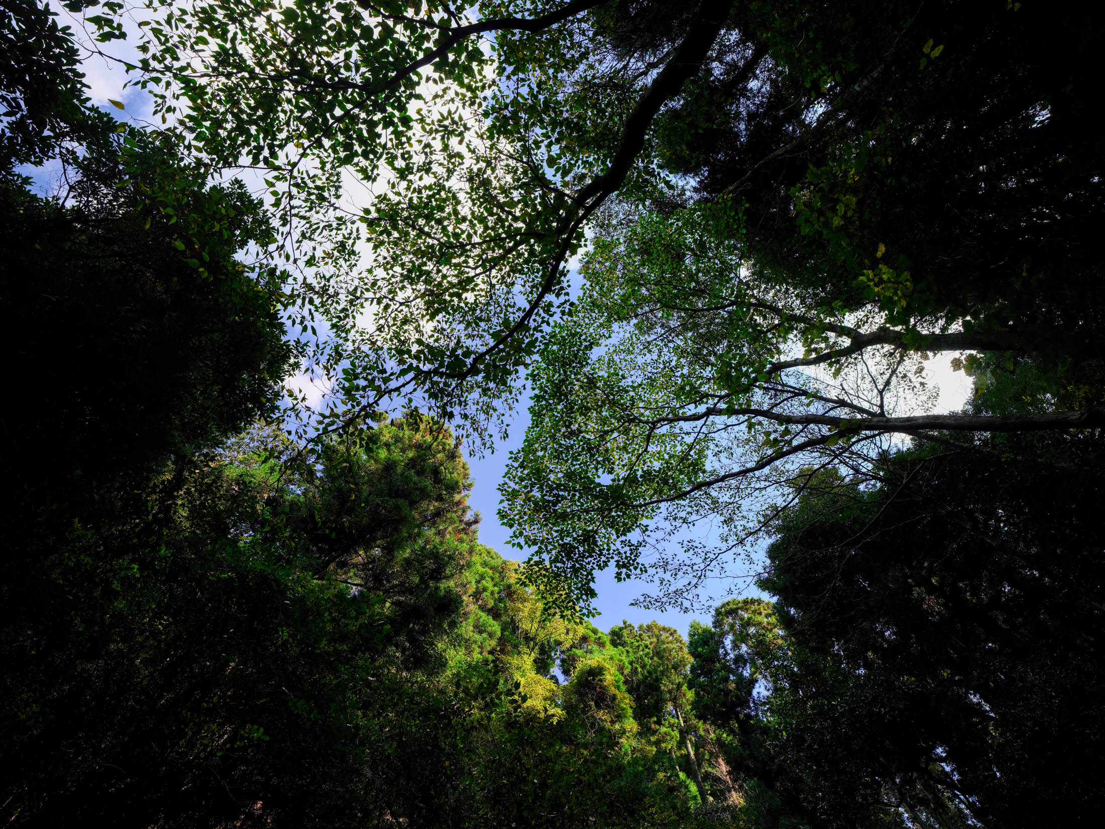 Looking up through a dense green forest canopy framing blue sky and clouds.