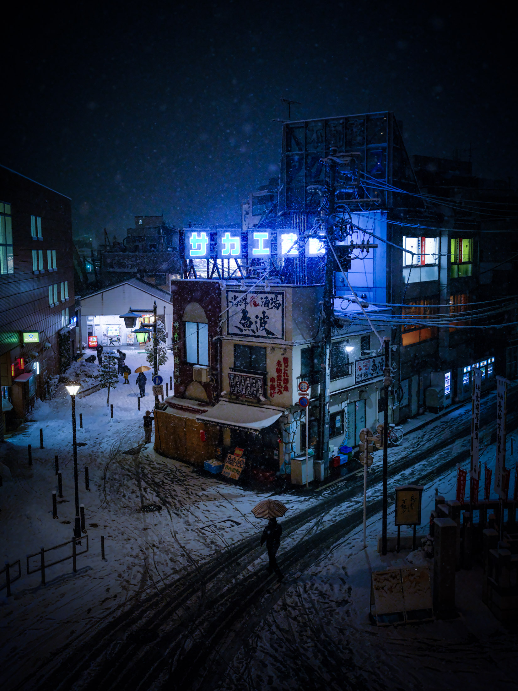 A cozy snowy night stroll down a Tokyo neighborhood street.