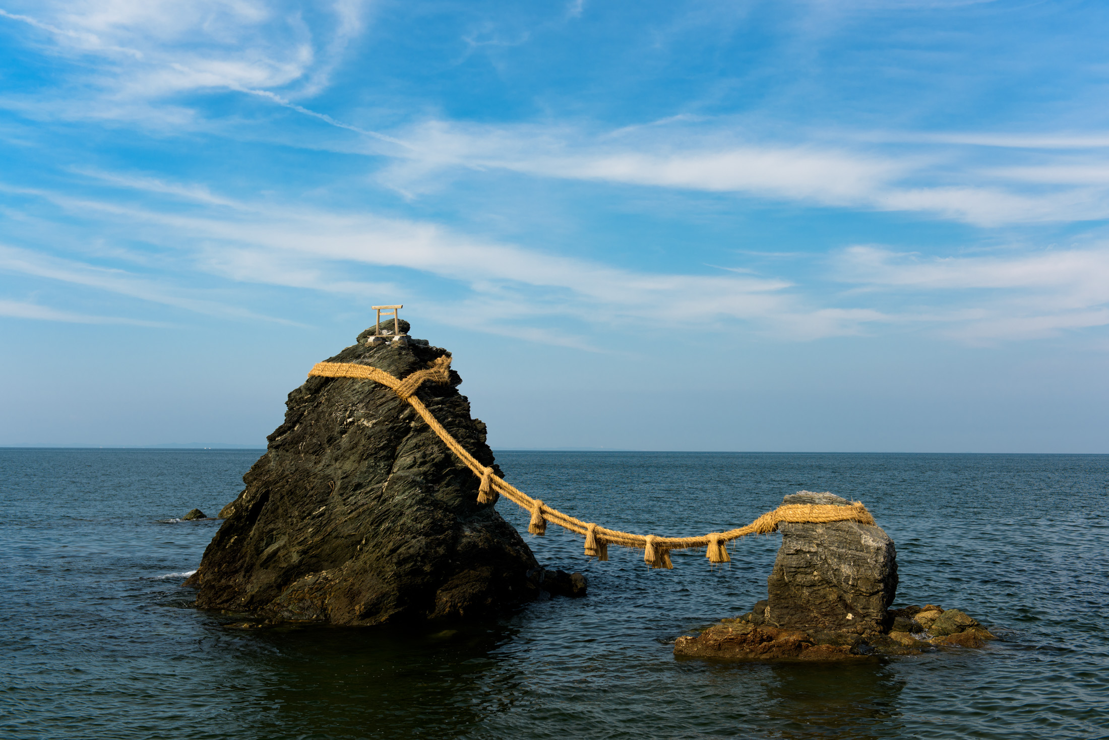 Iconic Meoto Iwa, the Wedded Rocks in Japan, symbolizing the union of deities in a serene ocean setting.