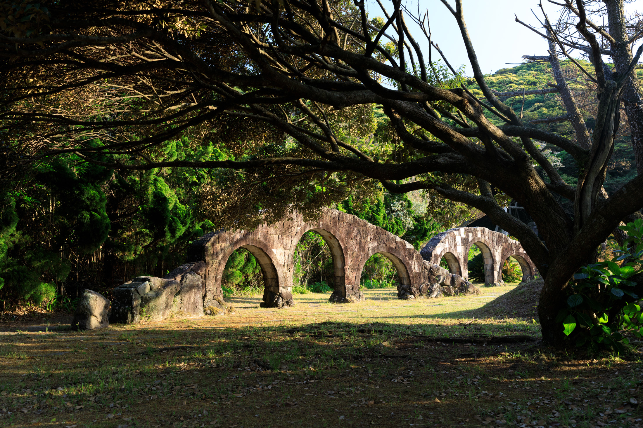 Discover the ancient stone archways nestled in lush greenery at Niijima Water Park.