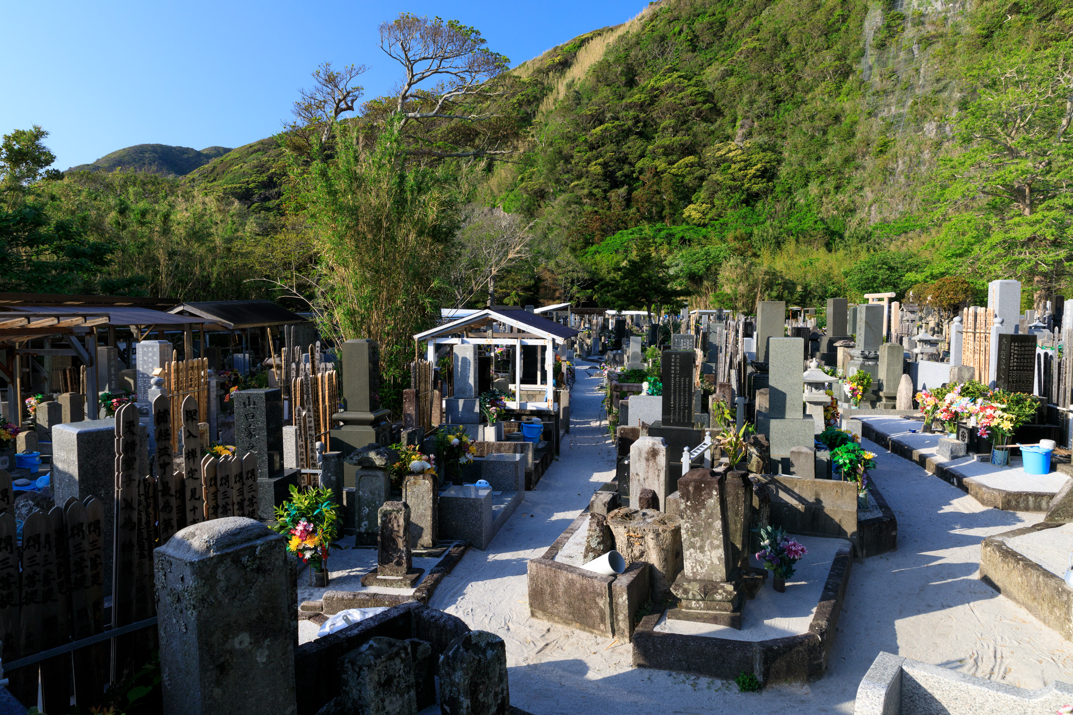 Tranquil cemetery adorned with unique tombstones, sake barrels, and dice, providing a serene setting for remembrance.