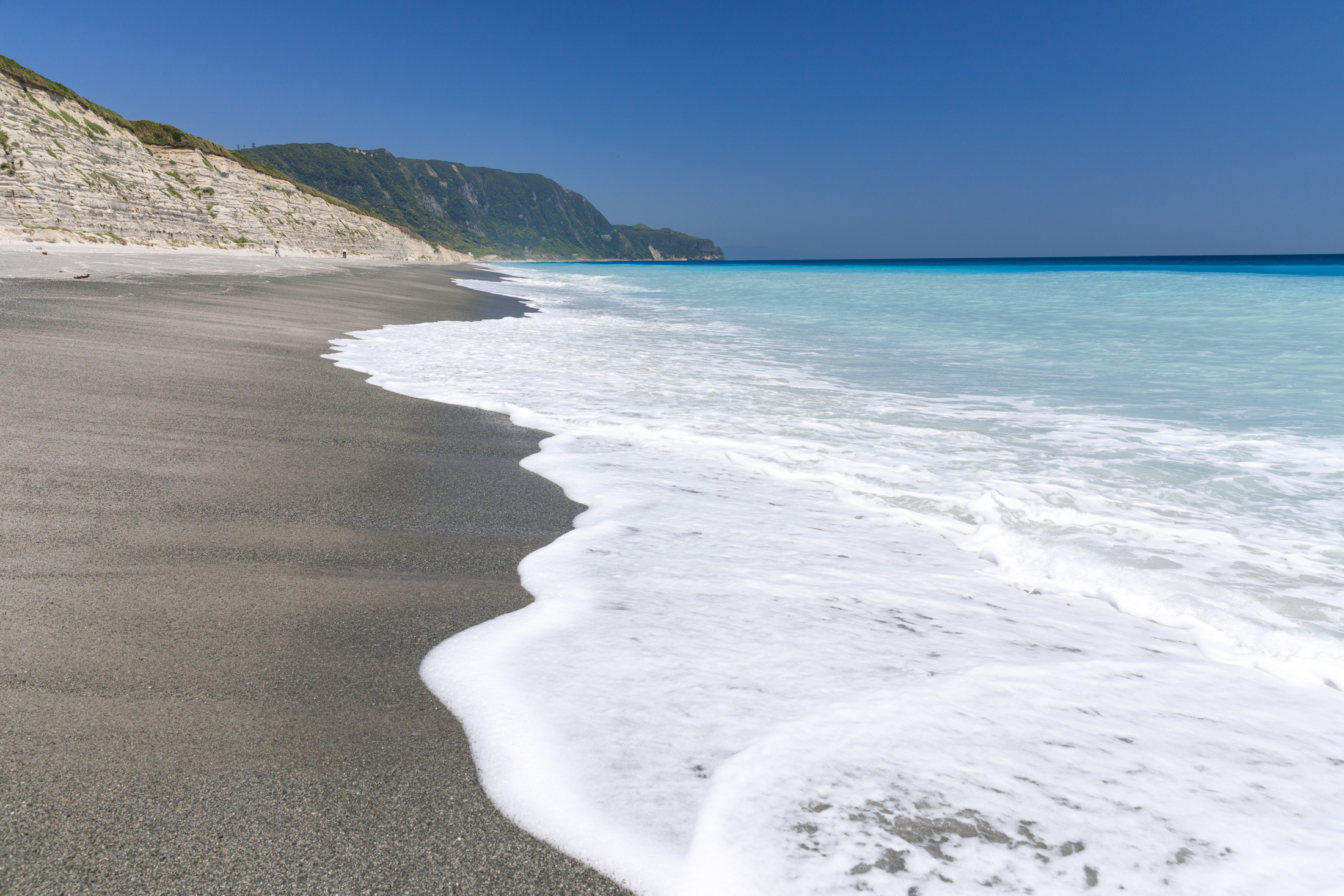 Majestic White Cliffs overlooking turquoise ocean and sandy beach in Niijima.