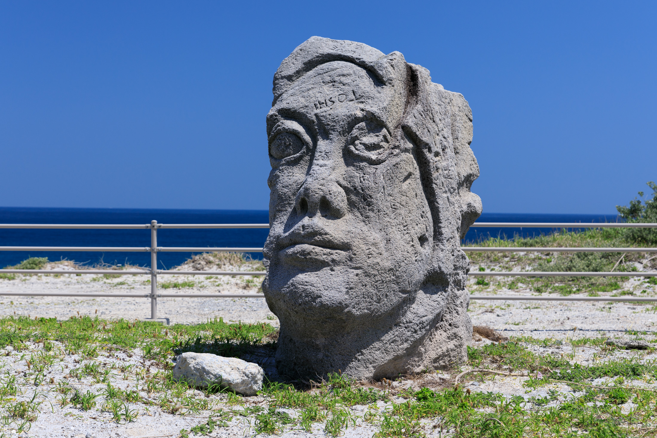 Enigmatic stone sculpture overlooking serene Habushiura Coast.