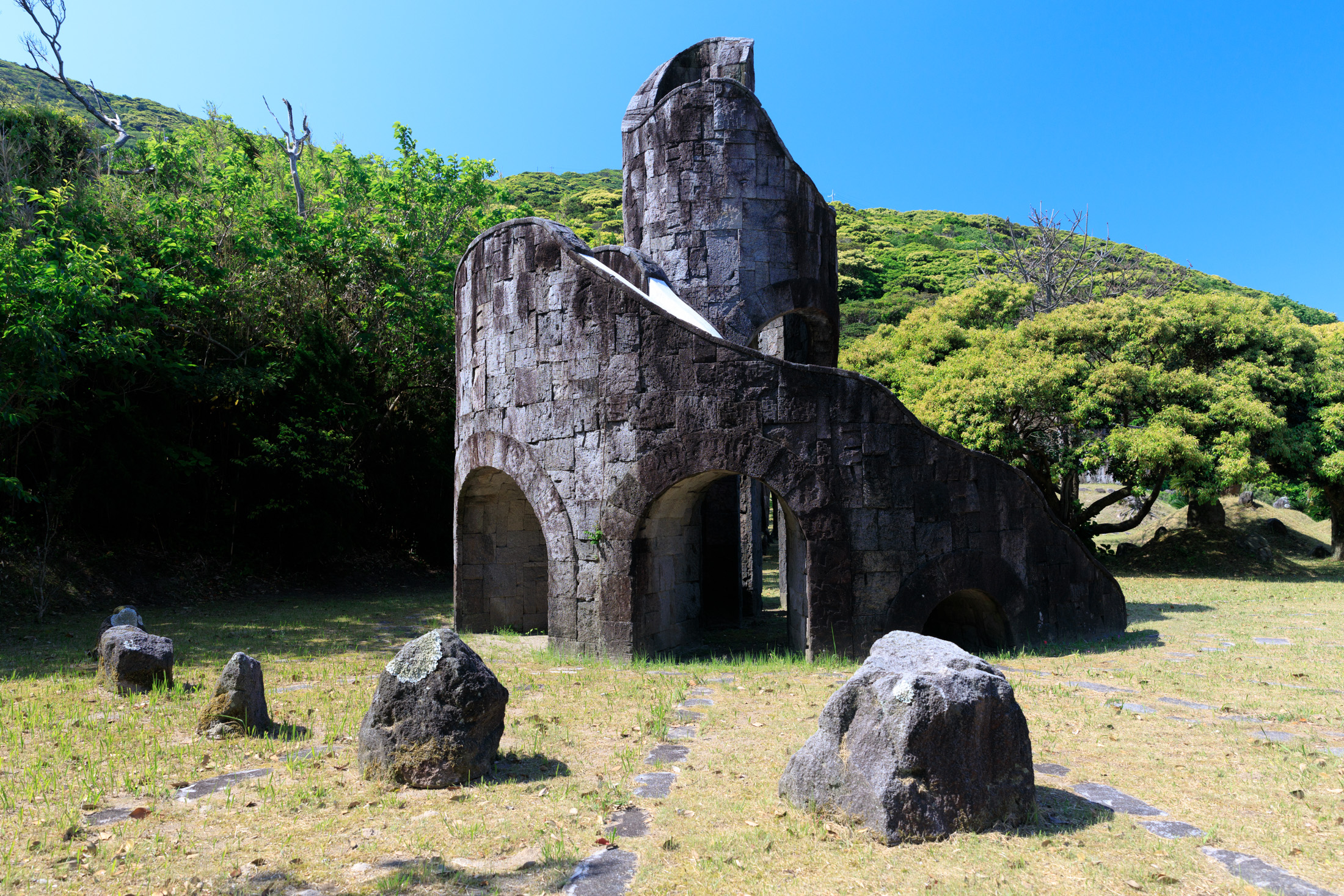 Discover the historic stone archway amidst lush greenery at Niijima Water Park.