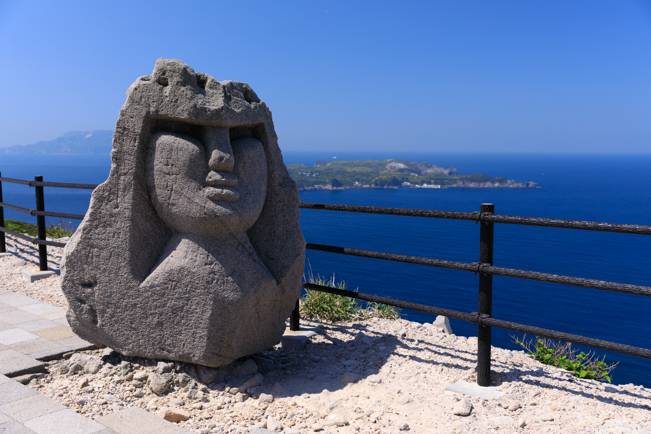 Majestic stone sculpture overlooking serene blue ocean from Ishiyama Observation Deck.