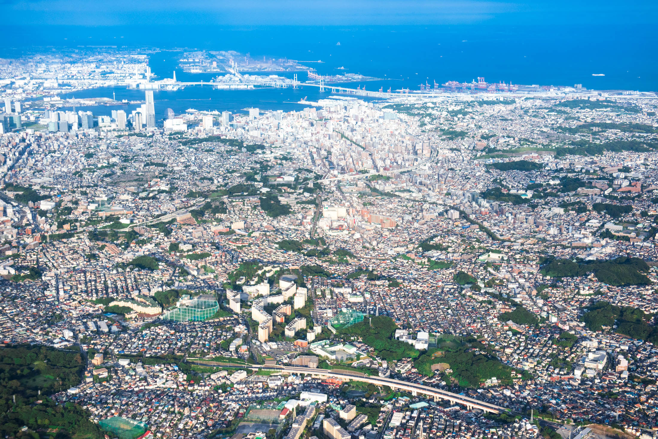 Experience the vibrant cityscape and natural beauty of Oshima Island from above.