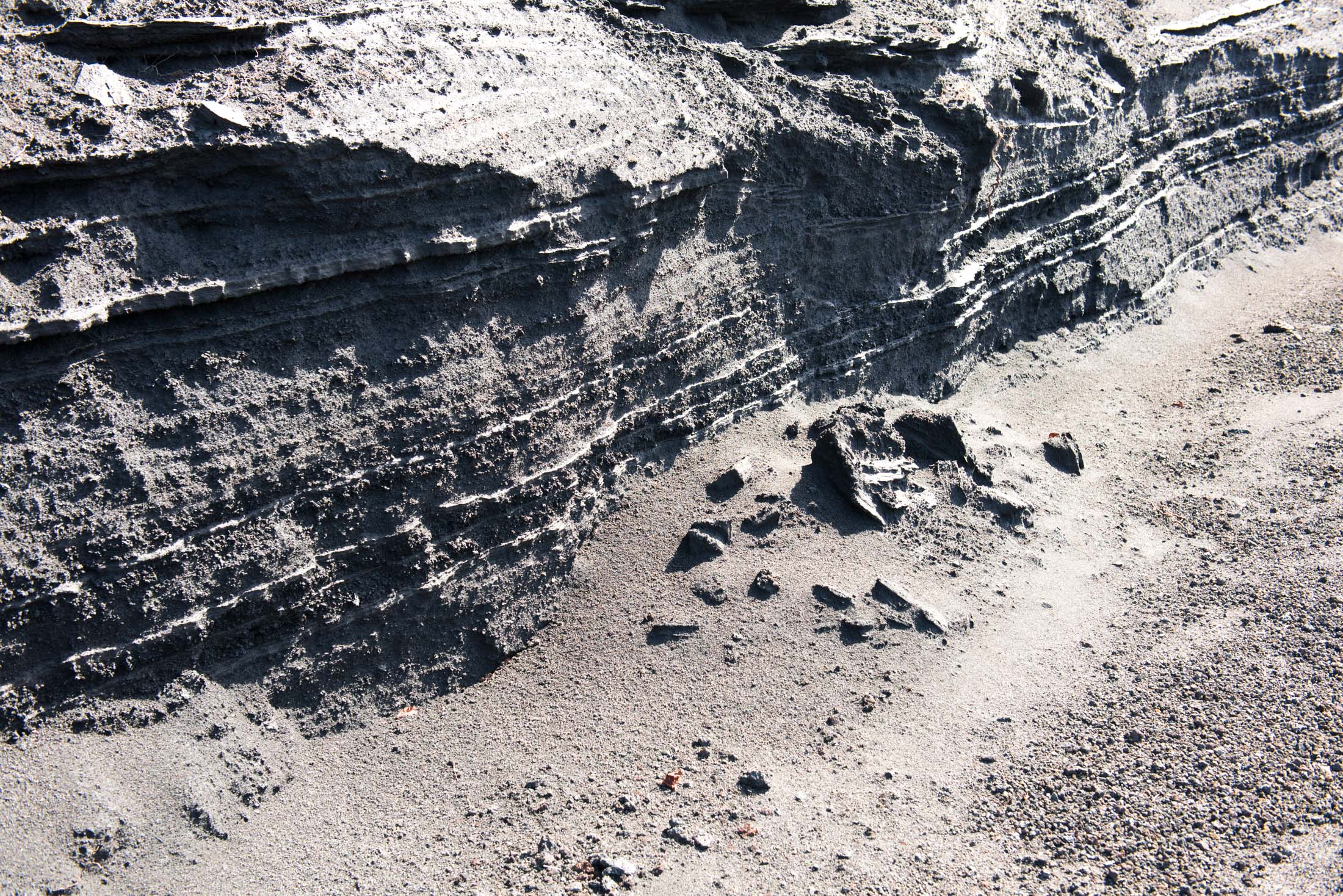Layered volcanic ash and sediment rock face on Oshima Island, with horizontal strata and a gravel-strewn slope below.