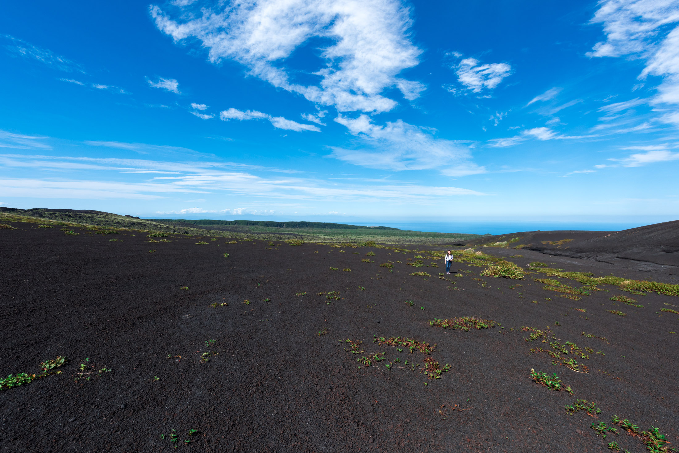Oshima Island volcanic ash fields with hardy green plants and a distant sea horizon under a bright blue sky.