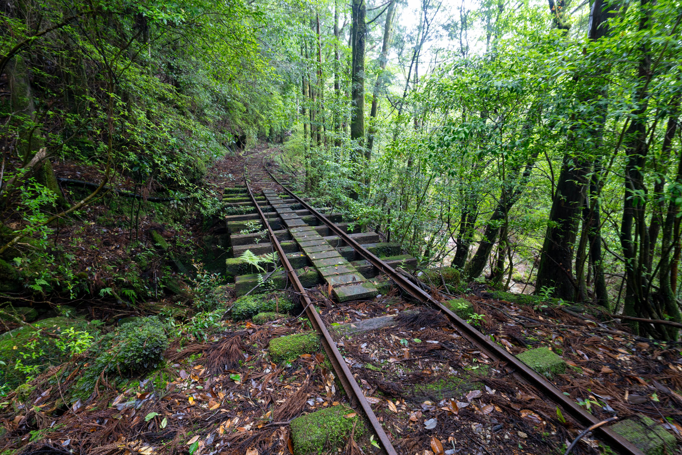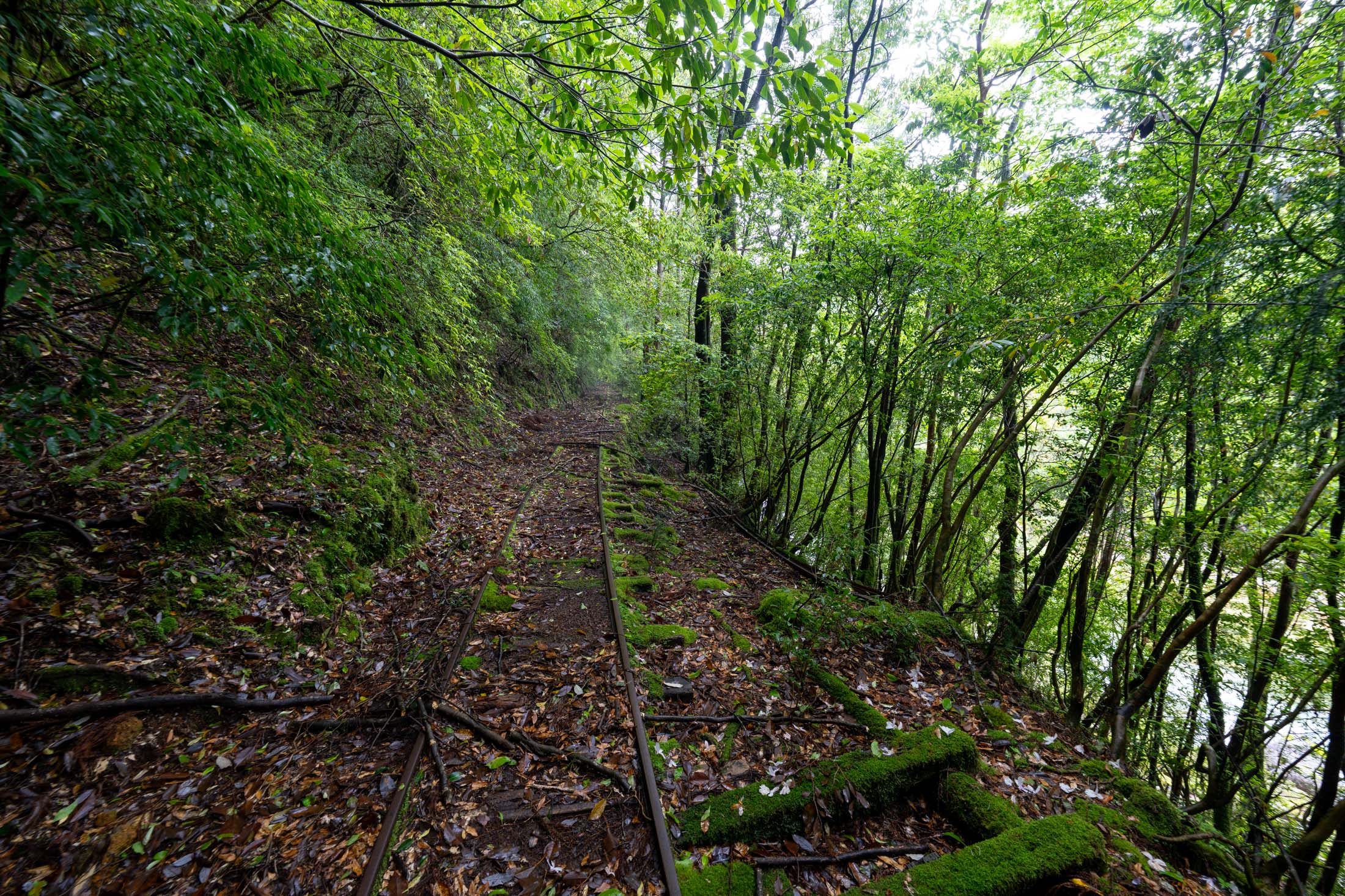 Overgrown narrow-gauge railway tracks disappear into a lush forest under dappled sunlight.