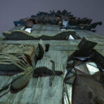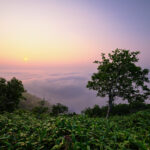 A weathered stone sculpture of a human face with eyes, nose, and mouth, set on a grassy area near the shore at Habushiura Coast. The deep blue ocean in the background creates a serene and picturesque coastal landscape.